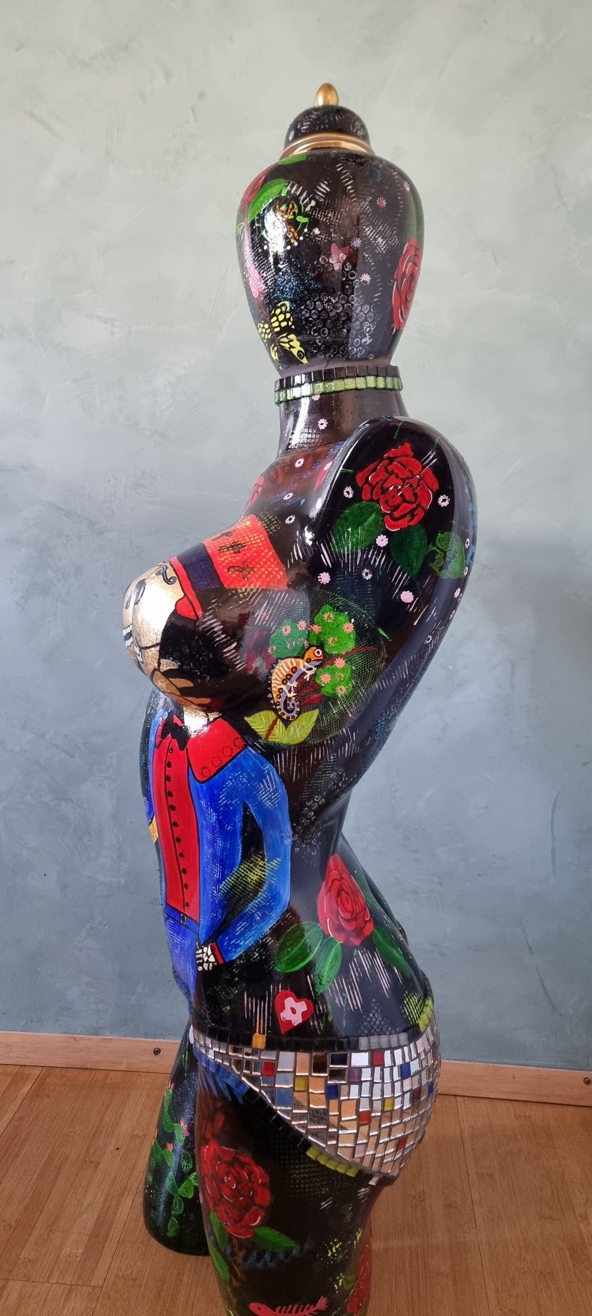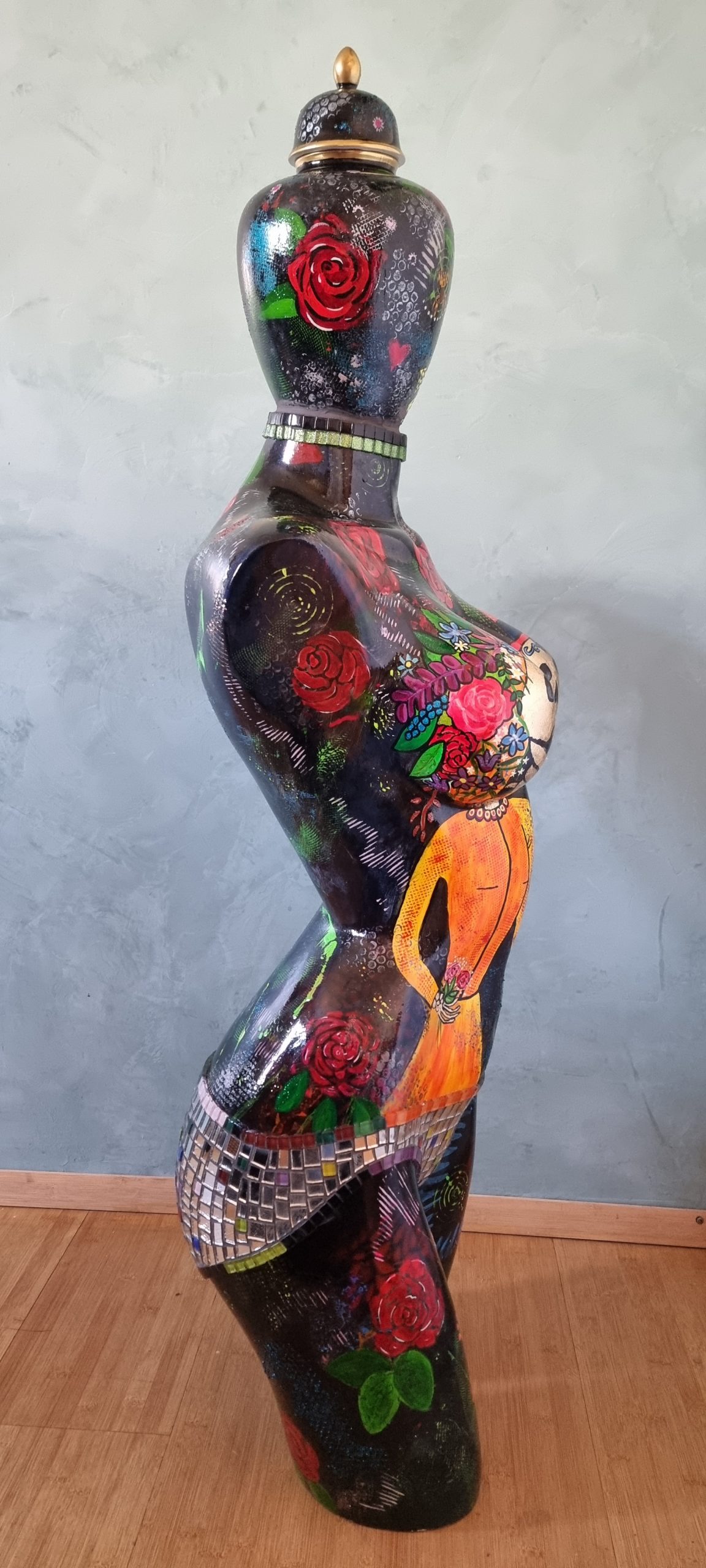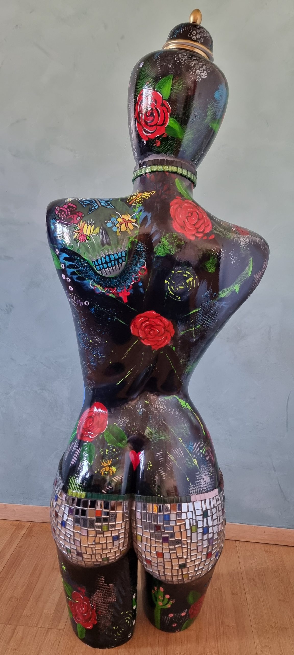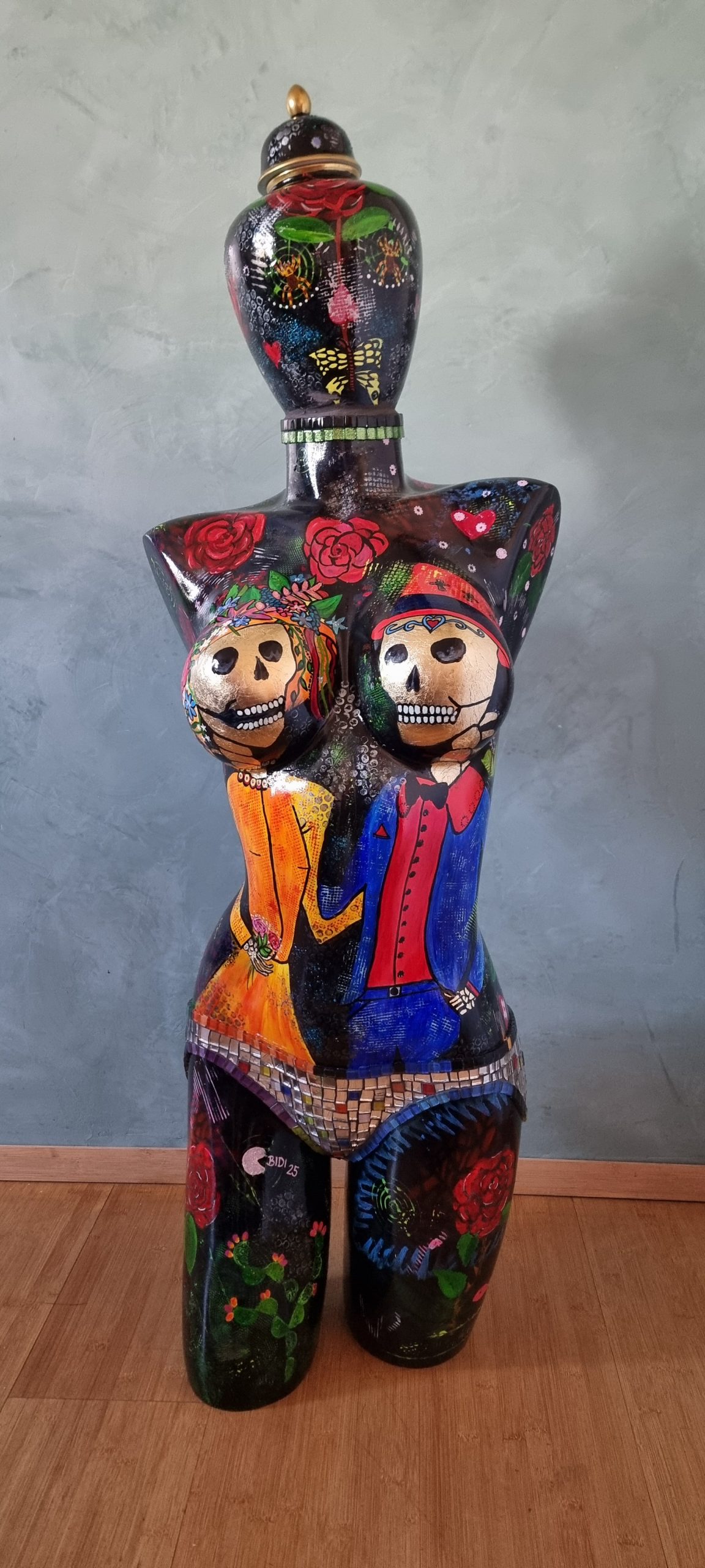 Zuerst war die Vase. Die erinnerte mich irgendwie an eine Urne. Und schon war die Idee für eine Figur im Stil “ Dia le los muertos“ geboren – dem „Tag der Toten“ , einem der wichtitgsten mexikanischen Feiertage, an dem traditionell an die Verstorbenen gedacht wird. Mit dieser Mosaikfigur bekommt der Ausspruch „Bis das der Tot Euch scheidet“ einen künstlerlischen Ausdruck. Ein echter Hingucker!