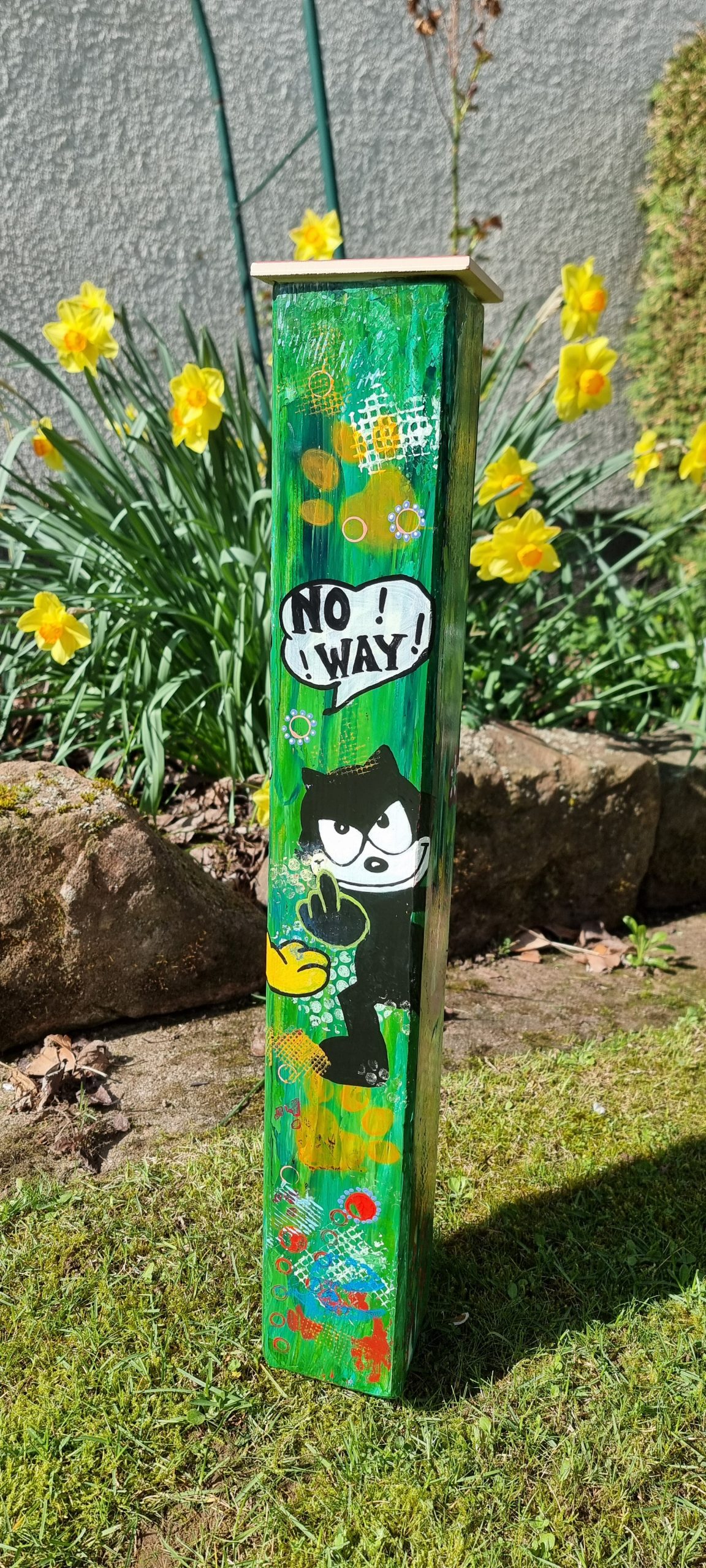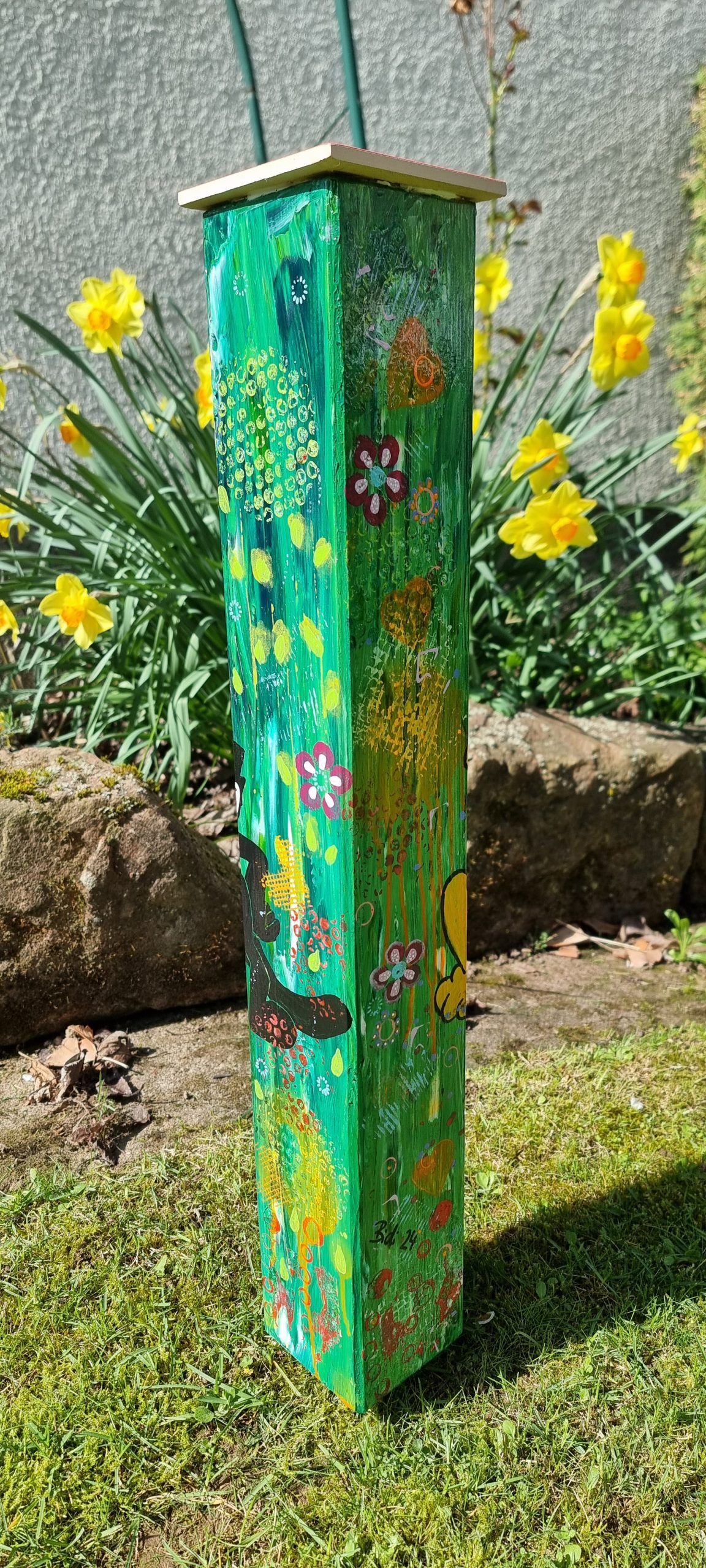 ca. 8,5cm x 8,5 cm x 60 cm. Die Stehle ist mit Acryl Farben bemalt und mit Bootslack versiegelt. Sie ist zusätzlich mit Mosaik verziert. Die Oberseite ist zum Schutz vor Nässe mit einer Fliese versehen. – VERKAUFT –