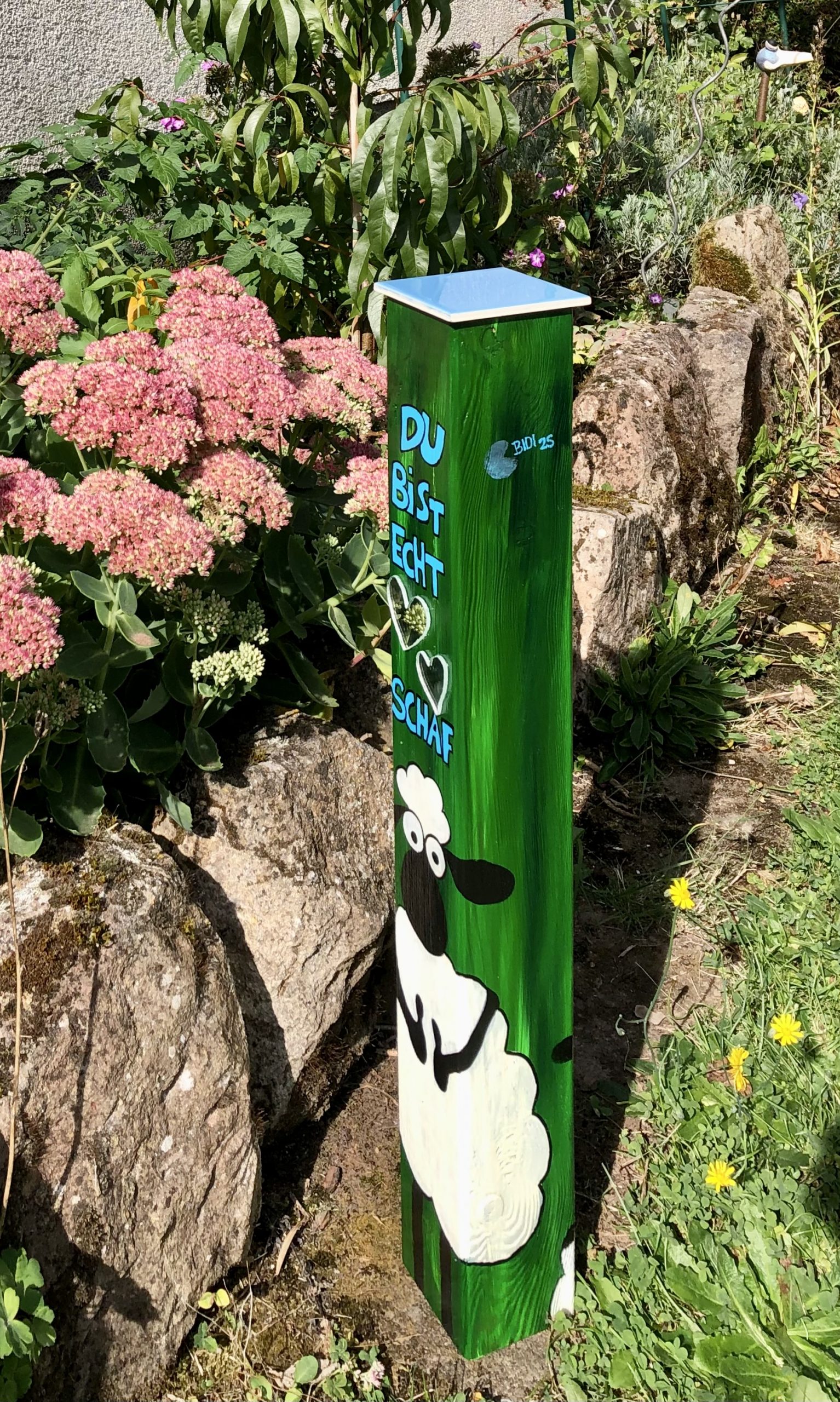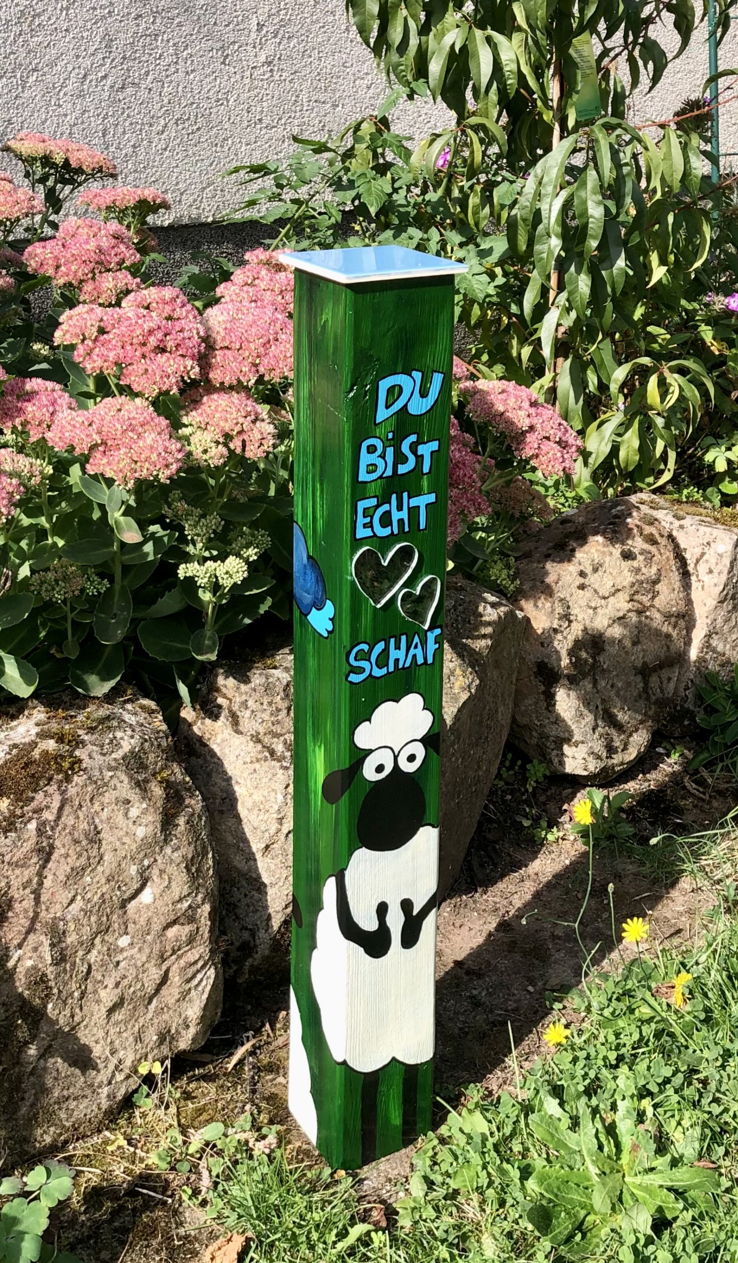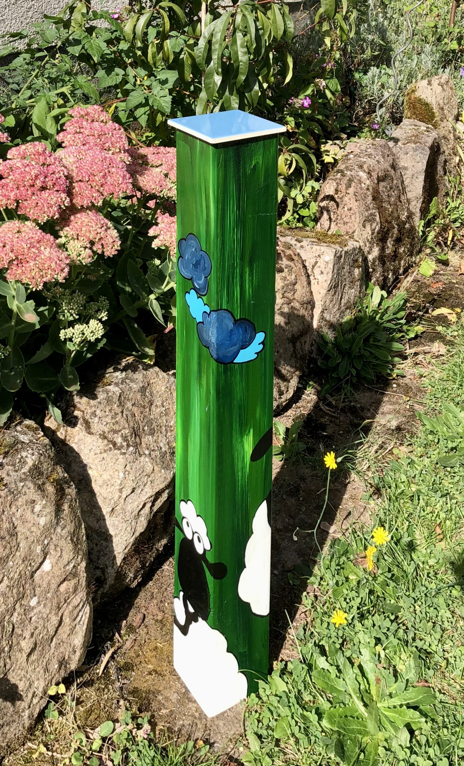 ca. 8,5cm x 8,5 cm x 70 cm. Die Stehle ist mit Acryl Farben bemalt und mit Bootslack versiegelt. Die Oberseite ist zum Schutz vor Nässe mit einer Mosaik Fliese versehen.