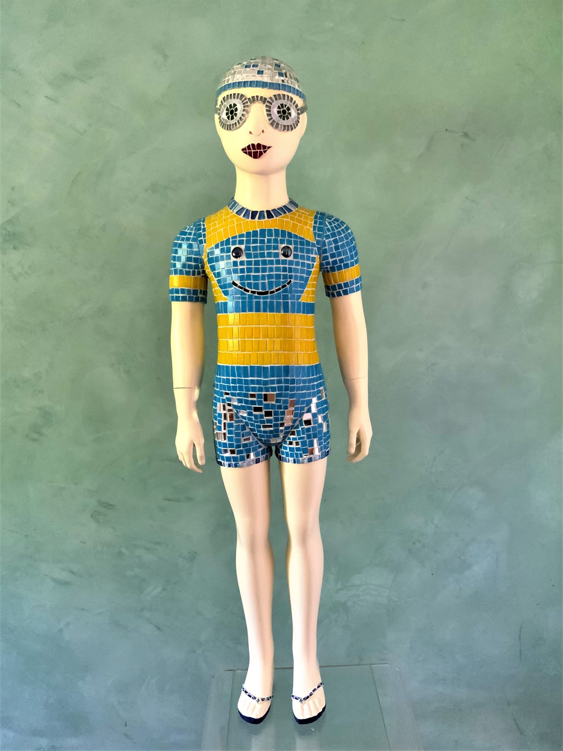Bei dieser Figur handelt es sich um eine Kinderfigur. Sie ist 115 cm groß. Verwendet wurden Glasmosaik und Spiegel .790 €